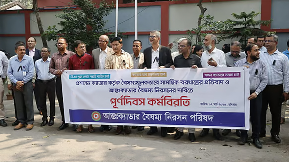 এর আগে, গতকাল আন্তঃক্যাডার বৈষম্য নিরসন পরিষদের বিজ্ঞপ্তিতে বলা হয়, সম্প্রতি ফেসবুকে লেখালেখির মতো তুচ্ছ কারণে ২৫ ক্যাডারের ১৩ জন কর্মকর্তাকে সাময়িক বরখাস্ত করা হয়েছে। একই ধরনের কাজ প্রশাসন ক্যাডারের সদস্যরা করলেও তাঁদের বিরুদ্ধে কোনো ব্যবস্থা গ্রহণ করা হয়নি। বৈষম্যপূর্ণ রাষ্ট্রীয় ব্যবস্থাকে কাজে লাগিয়ে প্রশাসন ক্যাডার ২৫ ক্যাডারের কার্যক্রমকে বাধাগ্রস্ত করতে এমন ব্যবস্থা গ্রহণ করেছে। প্রশাসন ক্যাডারের পক্ষপাতপূর্ণভাবে বিভিন্ন ক্যাডার কর্মকর্তাদের সাময়িক বরখাস্তের প্রতিবাদে এবং আন্তক্যাডার বৈষম্য নিরসনের দাবিতে আজ রোববার পরিষদভুক্ত সব ক্যাডার পূর্ণ দিবস কর্মবিরতি পালন করবে বলে গতকাল জানানো হয়েছিল। তারই অংশ হিসেবে আজ কর্মবিরতি পালিত হচ্ছে।