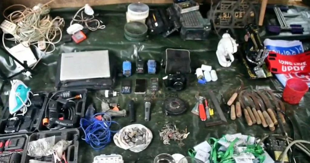 সোমবার (২১ এপ্রিল) ভোরে খাগড়াছড়ি জেলা সদরের ভাই-বোনছড়ার পূর্ণ চন্দ্র কারবারিপাড়া এলাকার একটি তালাবন্ধ টিনসেটের ঘরে অভিযান চালায় আইনশৃঙ্খলা বাহিনীর সদস্যরা। এসময় কাউকে আটক করতে না পারলেও চাঁদা আদায়ের রশিদ, ল্যাপটপ, মোবাইল, সামরিক ইউনিফর্মসহ বিপুল পরিমাণ প্রশিক্ষণ সরঞ্জামাদি উদ্ধার করতে সক্ষম হয়।