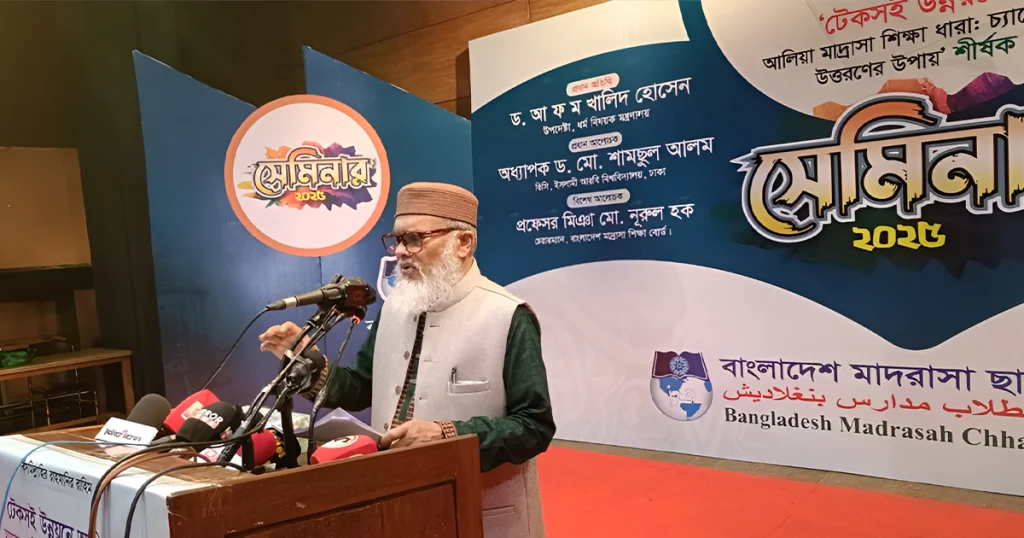 বুধবার (০৯ জুলাই) দুপুরে ঢাকার আইডিইবি মিলনায়তনে ‘টেকসই উন্নয়নে আলিয়া মাদরাসা শিক্ষা ধারা : চ্যালেঞ্জ ও উত্তরণের উপায়’ শীর্ষক সেমিনারে প্রধান অতিথির বক্তৃতায় তিনি এসব কথা বলেন। বাংলাদেশ মাদরাসা ছাত্রকল্যাণ পরিষদ এ সেমিনার আয়োজন করে।