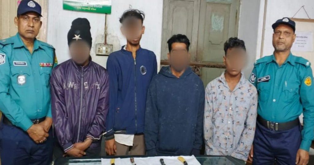 গ্রেপ্তারকৃতরা হলেন- সাইফুল মিয়া (২৬), মো. খুরশিদ আলম (২০), মো. রাব্বি (২০) ও জীবন শেখ (২৩)। এসময় তাদের কাছ থেকে তিনটি স্টিলের চায়নিজ চাকু ও একটি চাপাতি জব্দ করা হয়।
