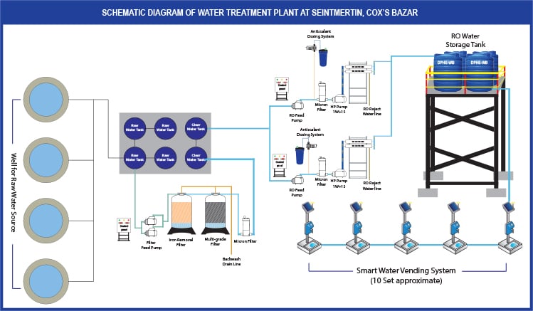 কক্সবাজার জনস্বাস্থ্য প্রকৌশল অধিদপ্তরের সহকারী প্রকৌশলী আবুল মনজুর বলেন, এই প্রকল্পের মধ্যে রয়েছে রেইন ওয়াটার, গ্রাউন ওয়াটার ও সারফেস ওয়াটার পরিশোধন করে সেন্টমার্টিন দ্বীপে বাসিন্দাদের মধ্যে খাবার পানি সরবরাহ করা। এতে করে দ্বীপে প্লাস্টিক বোতলের ব্যবহার বন্ধ করা সম্ভব হবে। তবে এই পানি সরবরাহ করতে প্রতিদিন যে ব্যয় হবে তা পানি গ্রহণকারীদের কাছ থেকে নেওয়া হবে। পানি গ্রহীতারা এটিএম কার্ডের আদলে বিশেষ কার্ডের মাধ্যমে ন্যূনতম ধার্যকৃত মূল্য দিয়ে নিজেদের ইচ্ছে মতো খাবার পানি নিতে পারবেন। এই পানির মান যাচাইয়ের জন্য থাকবে বিশেষ ল্যাবরেটরী। নির্মাণ করা হবে ইট, সিমেন্ট ও লোহার রড ছাড়া পরিবেশবান্ধব অপারেশন বিল্ডিং ও আন্তর্জাতিক মানের দু’টি পাবলিক টয়লেট। এছাড়াও মানব বর্জ্য, মেডিকেল বর্জ্য, কঠিন বর্জ্য ও প্লাস্টিক বর্জ্য মিলেই থাকবে সমন্বিত বর্জ্য ব্যবস্থাপনা (প্লাজমা রিয়েক্ট)। এই বর্জ্য ব্যবস্থাপনা বাংলাদেশে দ্বিতীয়। এই প্রকল্পের মধ্যদিয়ে বর্জ্য থেকে বিদ্যুত উৎপাদনের দিক থেকে তৃতীয় দেশ হিসেবে তালিকায় স্থান করে নিয়েছে বাংলাদেশ। এরআগে প্রকল্পটি পরিক্ষামুলক ভাবে কক্সবাজারের উখিয়া রোহিঙ্গা আশ্রয় শিবিরে চালু করে সফলতা আসে। প্রকল্পটি আগামী জুন মাসে শেষ হওয়ার কথা রয়েছে।