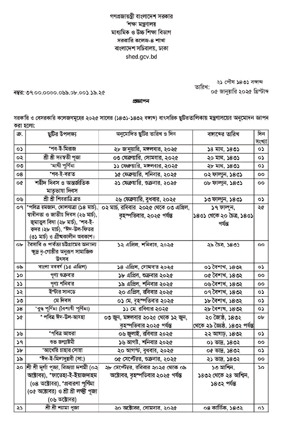 শিক্ষা মন্ত্রণালয় ২০২৫ সালের সরকারি-বেসরকারি কলেজ, সরকারি আলিয়া মাদরাসা ও টিটি কলেজের ছুটির তালিকা প্রকাশ করেছে।